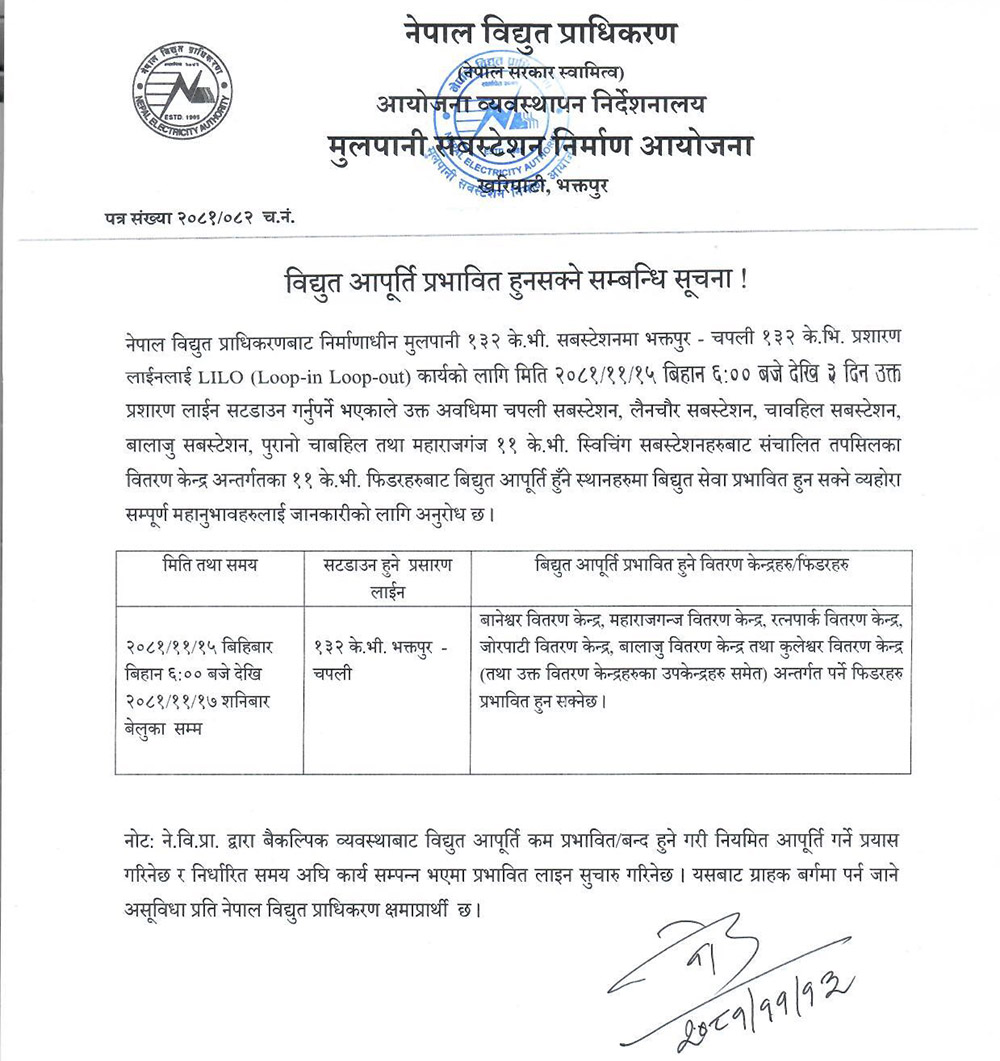 आजदेखि उपत्यकाका यी क्षेत्रमा विद्युत् आपूर्ति अवरुद्ध हुने