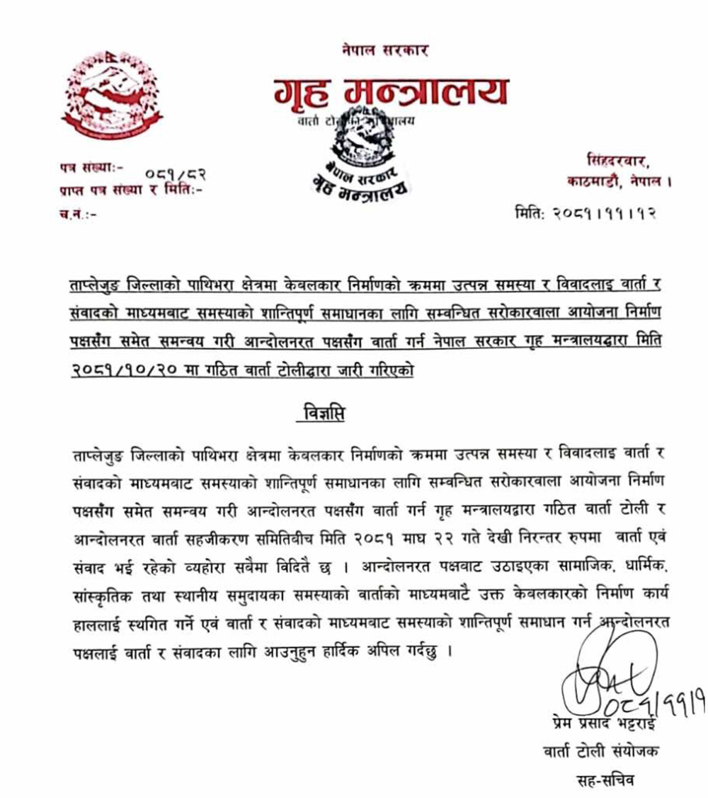 निर्माण बन्द गरेर बार्ताबाट सहमति खोज्न सरकारको ‘नो केबलकार’ अभियानलाई अपिल