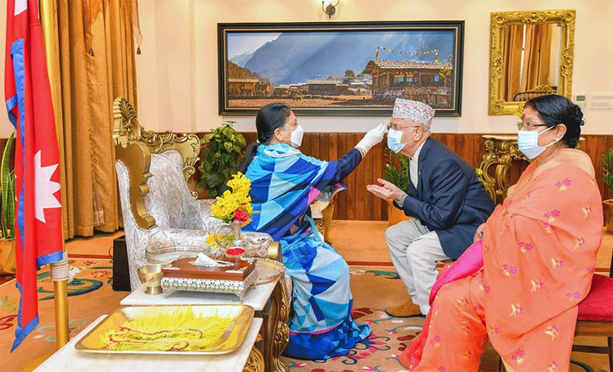 राष्ट्रपतिको हातबाट लगाउनुभयो प्रधानमन्त्री ओलीले दशैको टीका