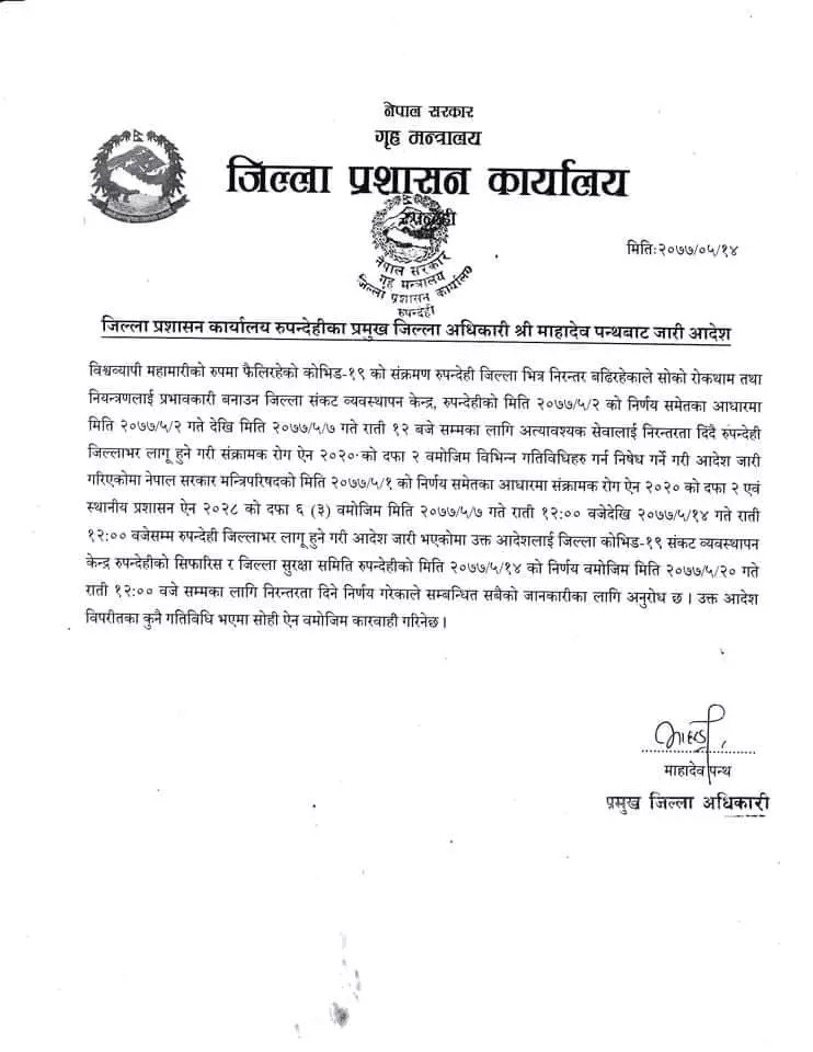 रुपन्देहीमा जारी निषेधआज्ञा भदौ २० गते सम्म थप