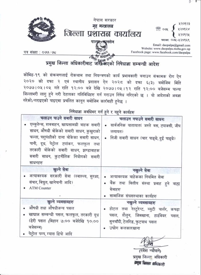 पाल्पामा शुक्रबार राती १२ बजेबाट निषेधाज्ञा
