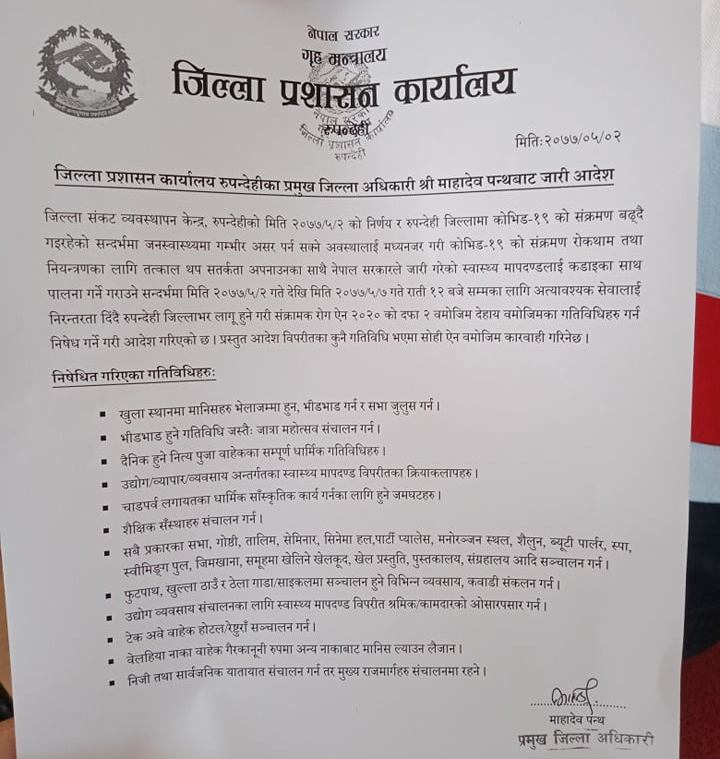 भदौ ७ सम्म रुपन्देहीमा निषेधाज्ञा