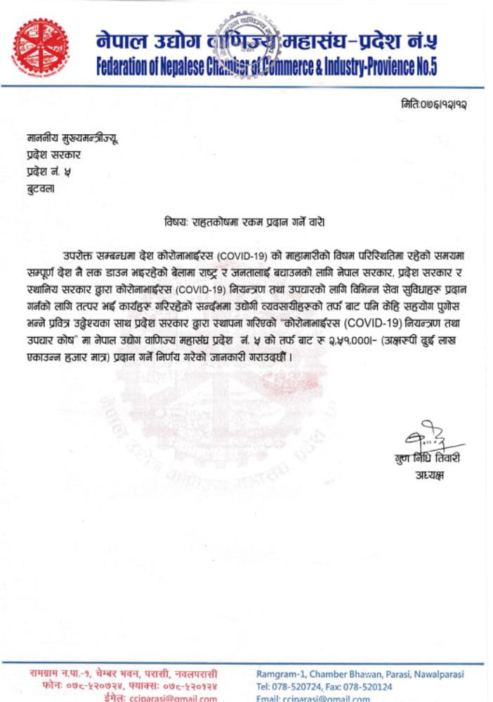 प्रदेश पाँचसरकारको कोरोना निणन्त्रण कोषमा नेउवामहासंघको सहयोग