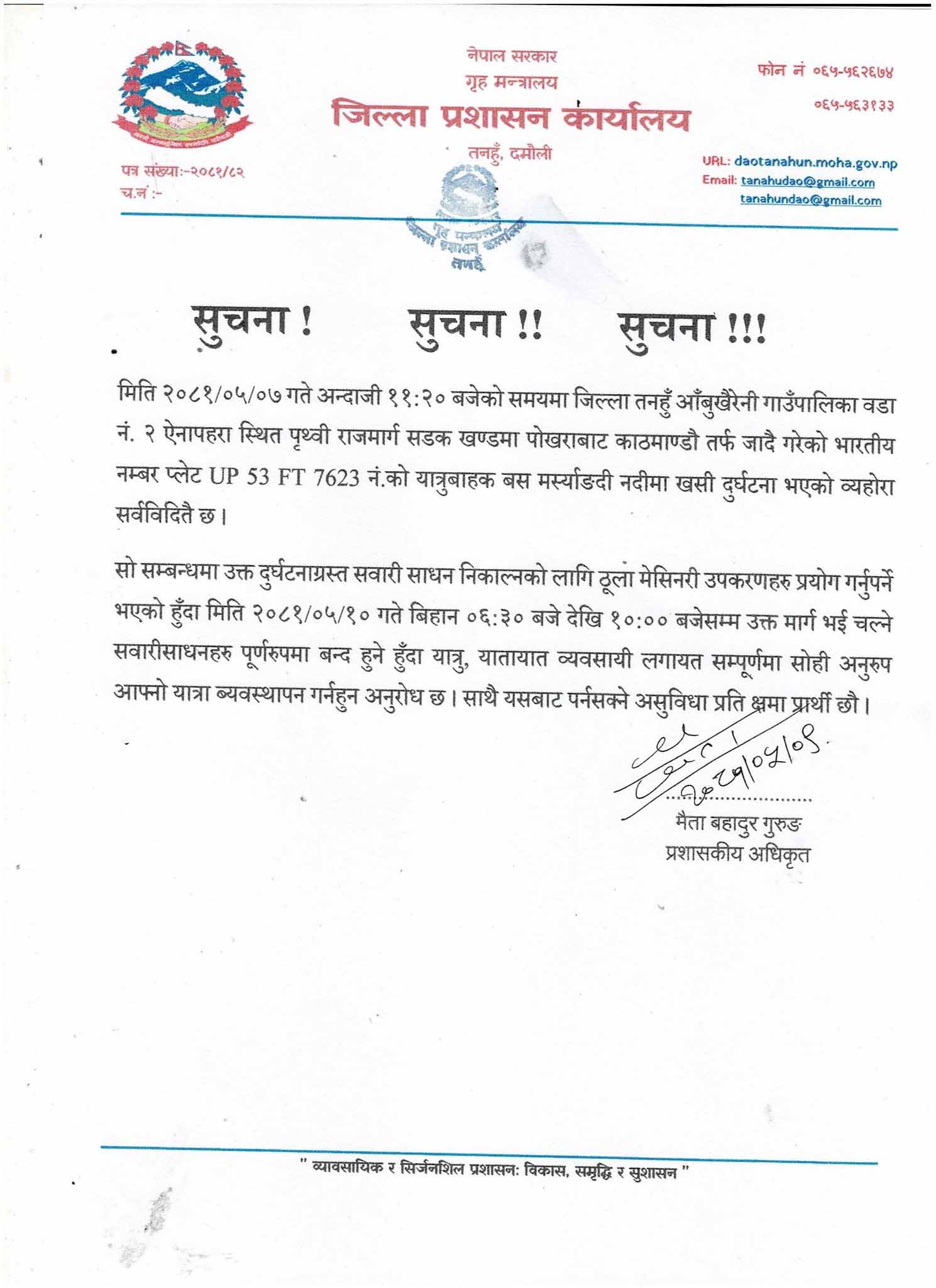 आँबुखैरेनी मर्स्याङ्दीमा खसेको बस निकाल्न आज साढे ३ घण्टा पृथ्वीराजमार्ग बन्द गरिने