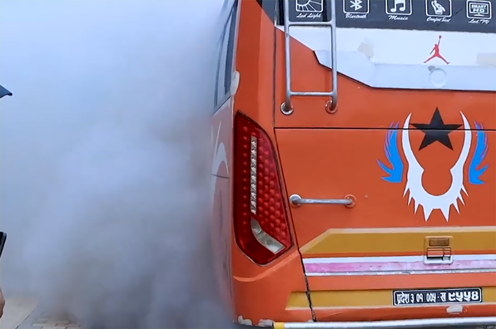 नयाँ बानेश्वर चोकमा गुडिरहेको बसबाट धुवाँको मुस्लो