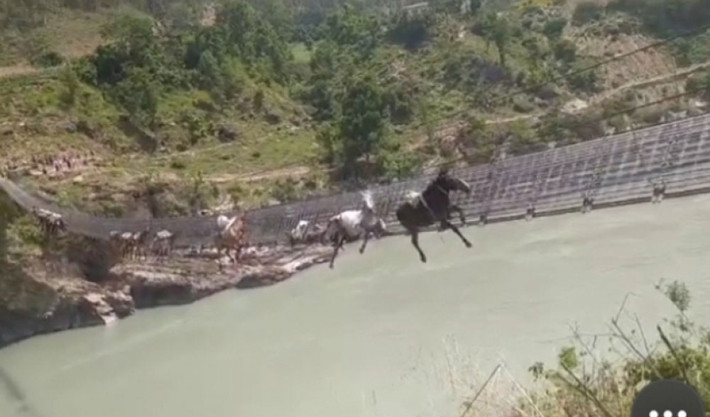झोलुङ्गे पुलको लठ्ठा चुँडिदा एक दर्जन खच्चर अड्किए, उद्धार जारी