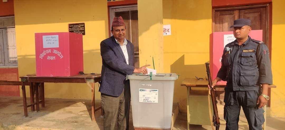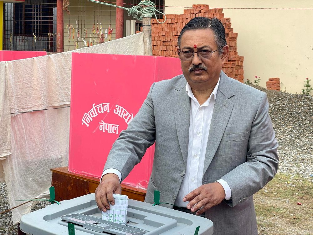 एमाले महासचिव पोखरेलद्धारा बिजौरी मतदान केन्द्रमा मतदान
