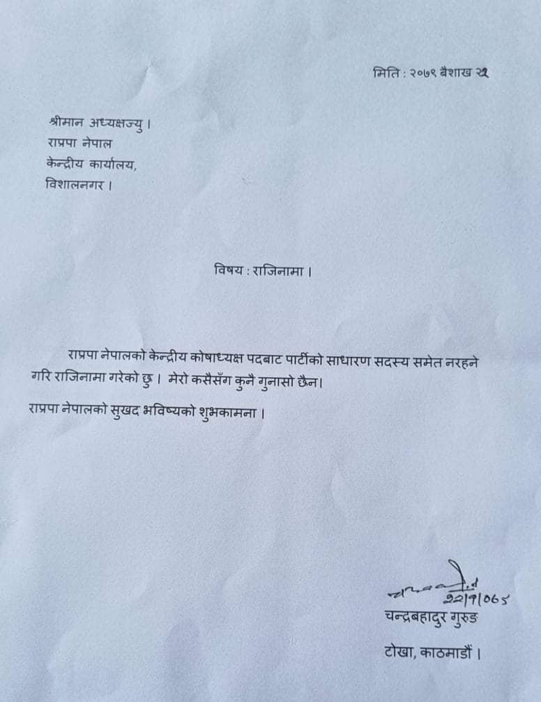 कमल थापाको साथ छोड्दै नेताहरू, कोषाध्यक्ष गुरुङलले पनि दिए राजीनामा