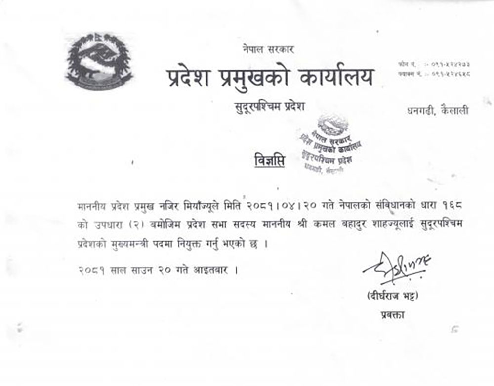 सुदूरपश्चिमको मुख्यमन्त्रीमा कमलबहादुर शाह नियुक्त