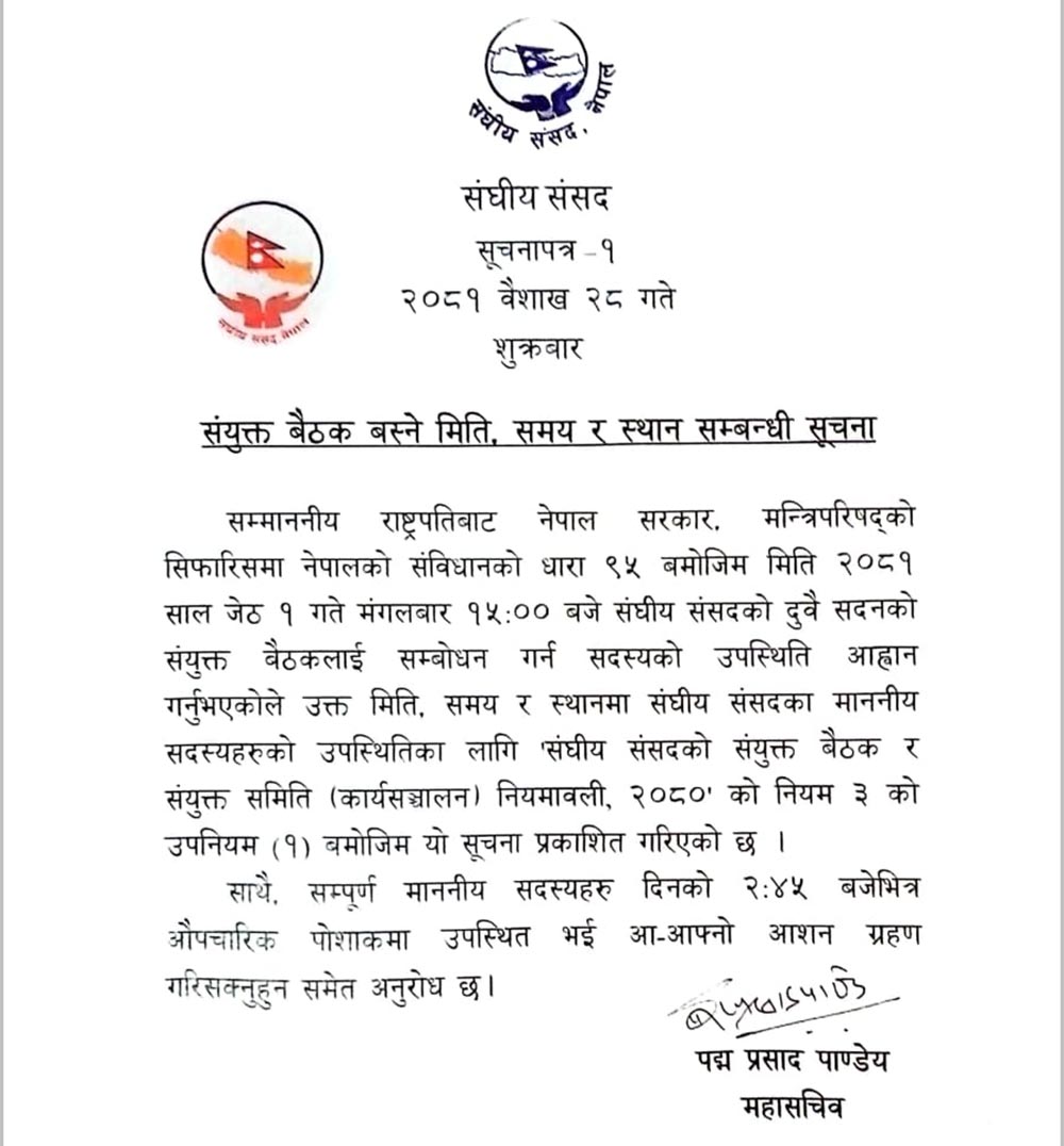 संसदको संयुक्त बैठकमा जेठ १ गते सरकारको नीति तथा कार्यक्रम प्रस्तुत हुने