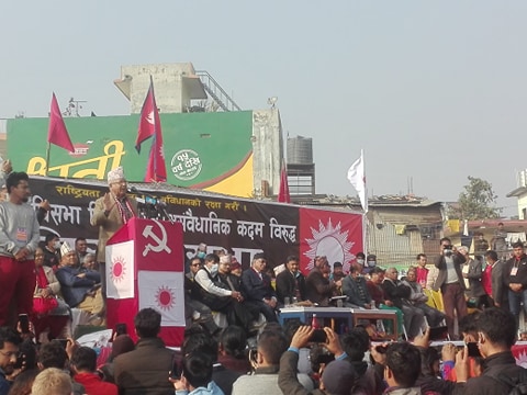 बिरोध सभामा बोल्दै पार्टीका अध्यक्ष माधव कुमार नेपालले ओलीले प्रतिगनको यात्रामा अंगाडी बढेको र सुधार गर्न नसकिएका कारण पार्टीको साधारण सदस्यबाट समेत निस्कासन गर्ने तयारी भएको बताए । नेपालले ओलीसंग संसद विघटनको विषयमा स्पष्टिकरण सोधेर साधारण सदस्यबाट निस्कासन गरिने बताए । उनले निर्वाचन आयोगले पहिले बुझाएको केन्द्रीय सदस्यको लिष्ट हेरेर निर्णय गर्ने भएकाले आधिकारिक नेकपा आफूहरुको हुने समेत दावी गर्दै ओलीतिर लागेकाहरुलाई आधिकारिक नेकपामा गोलवन्द हुने समेत आग्रह गरे ।