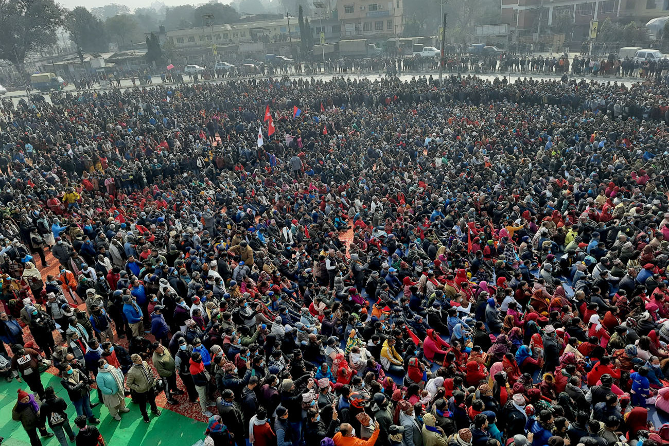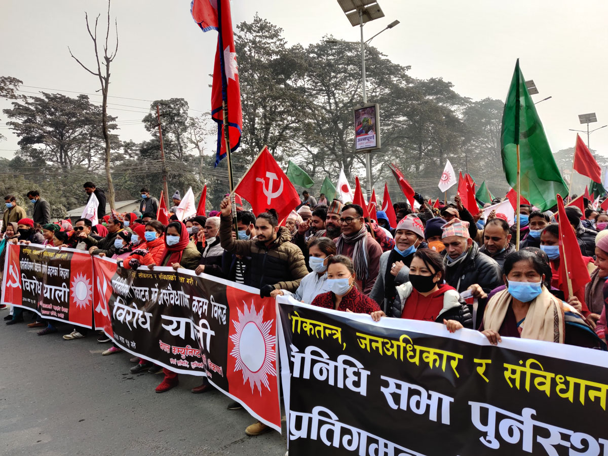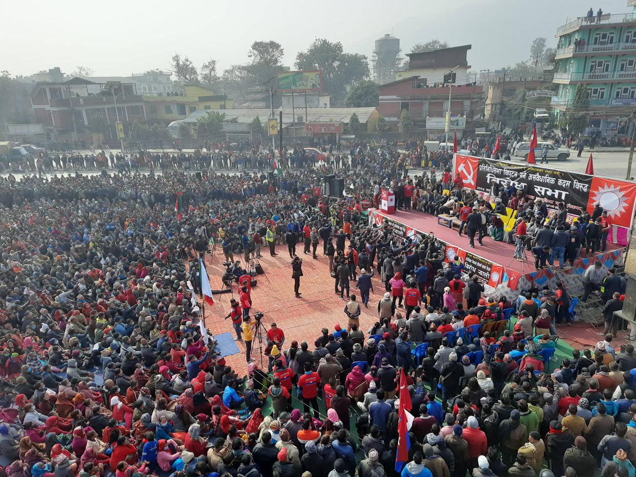 प्रतिनिधि सभाको विघटनविरुद्ध प्रचण्ड–नेपाल पक्षीय नेकपाले आज बुटवलमा आयोजना गरेको विशाल विरोधसभालाई सम्बोधन गर्दै प्रचण्डले भने–‘ आज केपी ओलीले सबै जनताको सपनामाथि कुठारागात र लोकतन्त्रको हत्या गर्ने काम गरेको बताए । प्रचण्डले नेपाली राजनीतिको इतिहासमा पुनः एक पटक तानाशाहाको जन्म हुन लागेको बताए ।