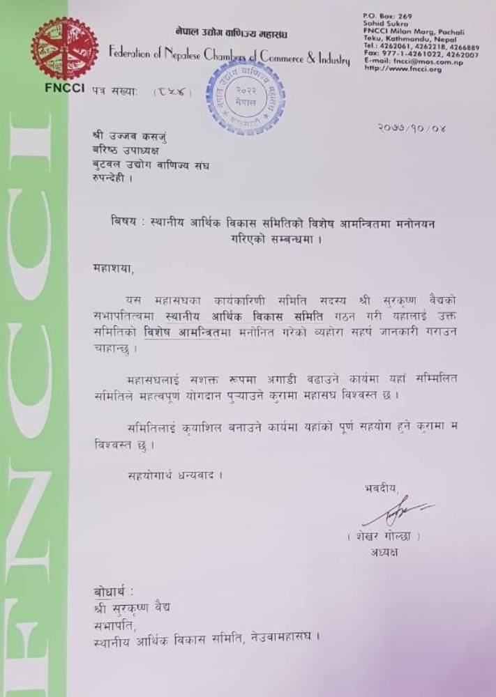 बुटवल । बुटवल उद्योग बाणिज्य संघ रुपन्देहीका वरिष्ठ उपाध्यक्ष उज्वल कसजुलाई नेपाल उद्योग बाणिज्य महासंघले स्थानीय आर्थिक बिकास समितिको बिशेष आमन्त्रितमा मनोनित गरेको छ । महासंघका कार्यकारिणी समितीका सदस्य सुरकृष्ण बैद्यको सभापतित्वमा गठित बिशेष आर्थिक बिकास समितिको बिशेष आमन्त्रितमा महासंघका अध्यक्ष शेखर गोल्छाले बुटवल उद्योग बाणिज्य संघका वरिष्ठ उपाध्यक्ष कसजुलाई मनोनित गर्नुभएको हो ।