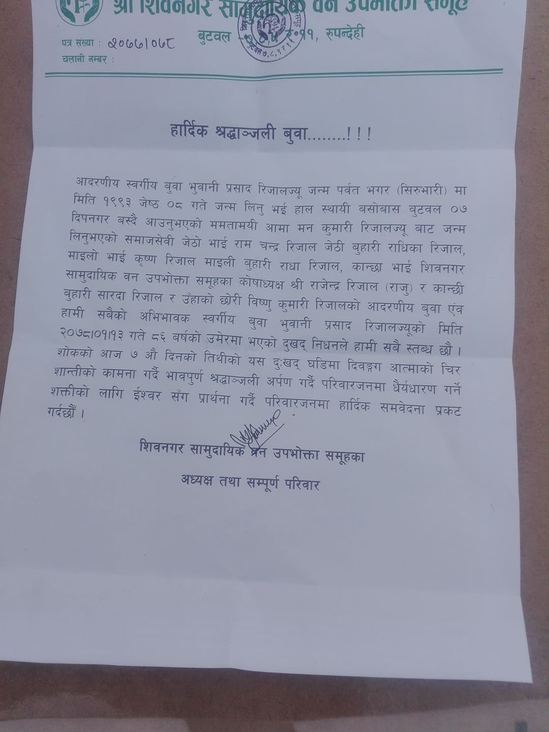 आईतबार शिवनगर सामुदायिक बन उपभोक्ता समितीका अध्यक्ष कार्य समितीका पदाधिकारीहरु, लेखा समितीका पदाधिकारीहरु तथा सल्लाहकारहरु स्वर्गिय भुवानी प्रसाद रिजालको निवासमा पुगी श्रद्धान्जली सभा गरिएको हो ।