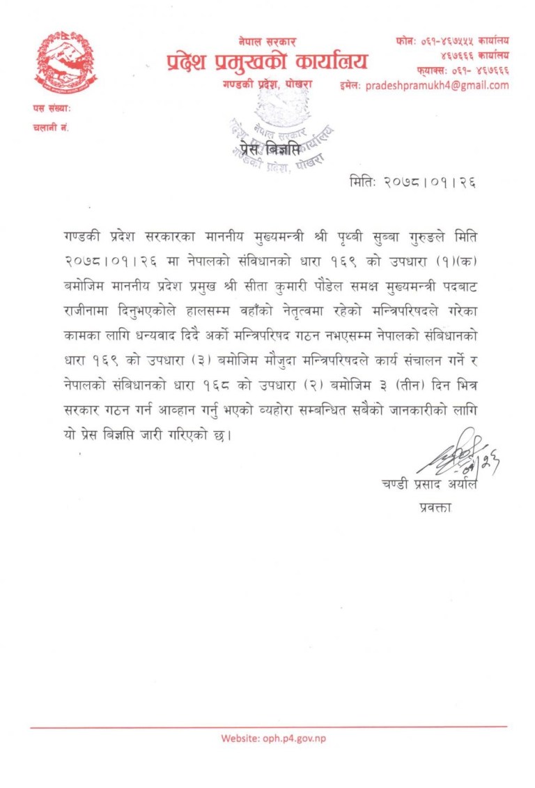 मुख्यमन्त्री गुरूङले राजीनामा दिएसँगै प्रदेश प्रमुख पौडेलले ३ दिनभित्र नयाँ सरकार गठन गर्न आह्वान गरेकी छन् ।