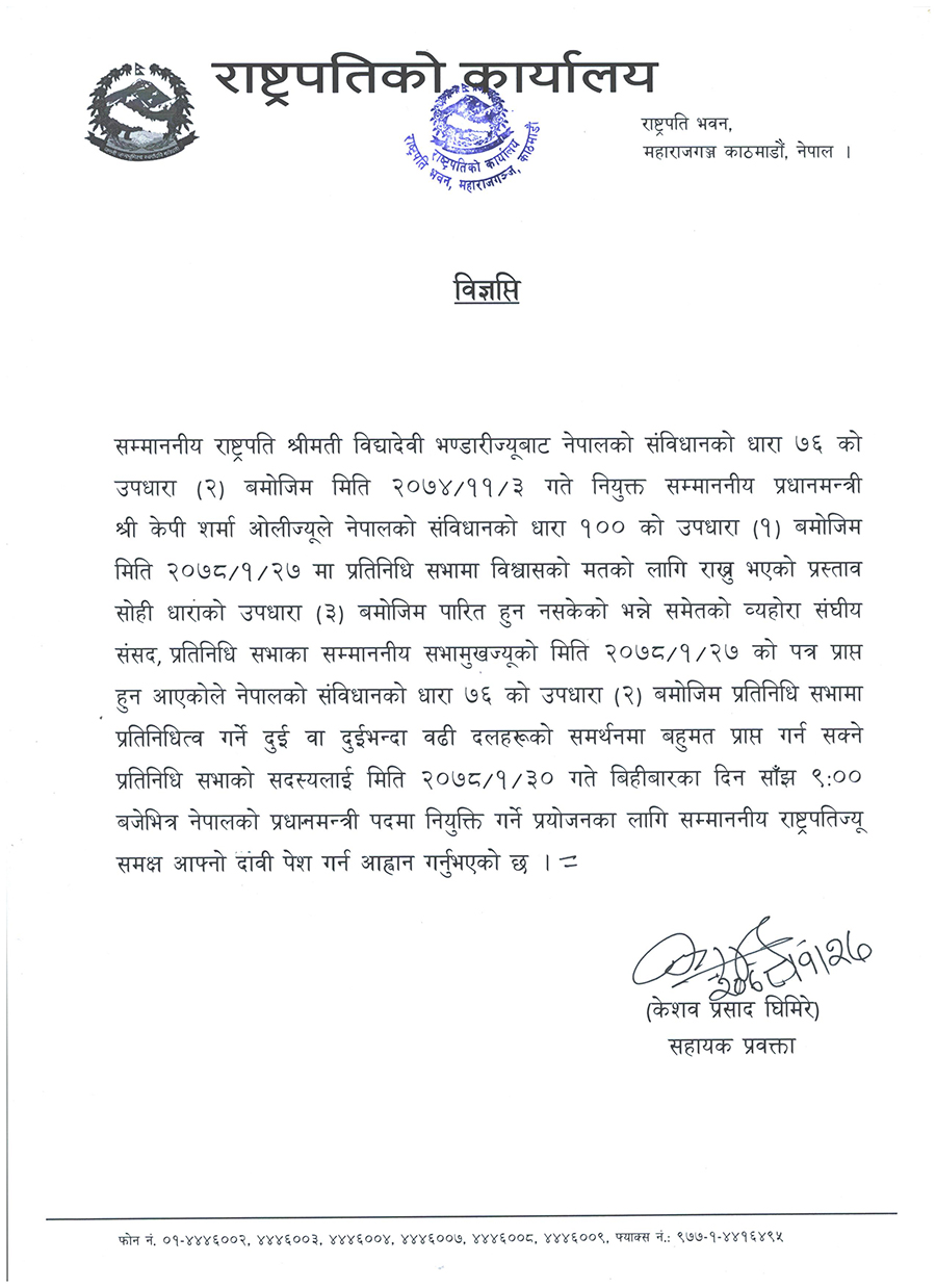 काठमाडौं । राष्ट्रपति विद्यादेवी भण्डारीले बहुमतको सरकार गठन गर्न दलहरुलाई आह्वान गर्नुभएको छ । प्रधानमन्त्री केपी शर्मा ओली पदमुक्त भएपछि राष्ट्रपतिले संविधानको धारा ७६ ९२० अनुसार संसदमा प्रतिनिधित्व गर्ने दुई वा दुईभन्दा बढी दलको समर्थनमा बहुमत प्राप्त गर्न सक्ने संसद सदस्यलाई तीन दिनभित्र दाबी पेश गर्न आह्वान गर्नुभएको हो ।