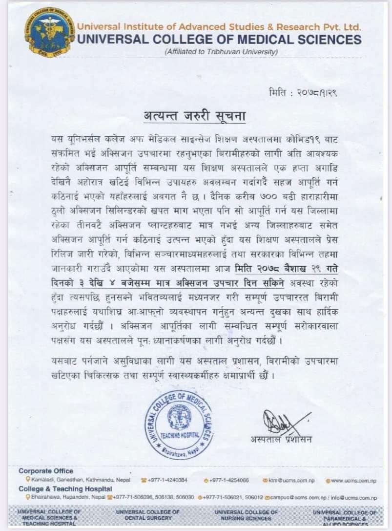 बुटवल । रुपन्देहीको भैरहवा स्थित युनिभर्सल कलेज अफ मेडिकल साईन्सेस शिक्षण अस्पतालमा अक्सिजन अभाव भएको छ । शिक्षण अस्पतालले बुधबार एक बिज्ञप्ती जारी गरी अक्सिजन आपूर्तिको प्रयास गर्दा गर्दै पनि नसकिएको उल्लेख गर्दै बिरामीलाई आफै व्यबस्था गर्न आग्रह गरेको हो । अस्पतालले जारी गरेको सूचनामा बुधबार दिउँसो ४ बजेसम्मको लागि मात्रै अक्सिजन पूर्ति गर्न सकिने र त्यसपछि बिरामीले आफै व्यबस्था गर्नुपर्ने उल्लेख गरिएको छ ।