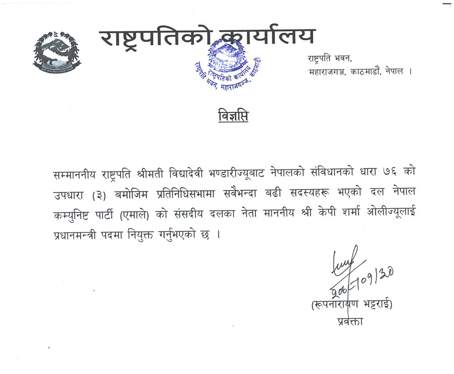 काठमाडौं । नेकपा एमाले संसदीय दलका नेता केपी शर्मा ओली प्रधानमन्त्री नियुक्त हुनभएको छ । राष्ट्रपति विद्यादेवी भण्डारीले संविधानको धारा ७६(३) अनुसार संसदको सबभन्दा ठूलो दलको संसदीय दलको नेता ओलीलाई प्रधानमन्त्रीमा नियुक्त गर्नुभएको हो ।