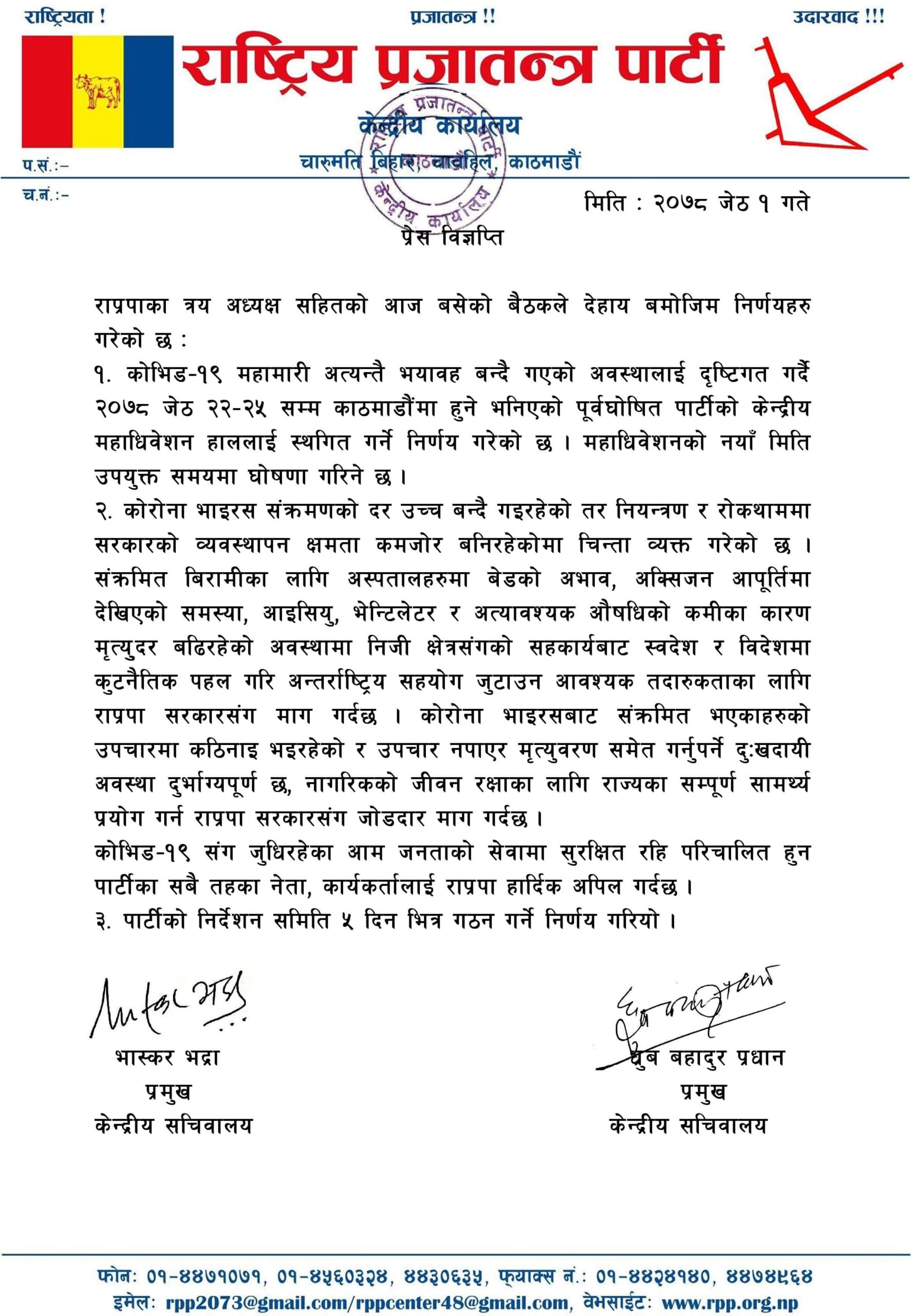 यहि जेष्ठ २२-२५ गतेसम्म काठमाडौंमा हुने भनिएको केन्द्रिय महाधिवेशन हाललाइ स्थगित गरिएको राप्रपाले जनएको छ। राप्रपा केन्द्रिय सचिवालय प्रमुख द्वय ध्रुव बहादुर प्रधान र भास्कर भद्राले एक बिज्ञप्ति जारी गरि संक्रमण भयावह रुपमा फैलिरहेकोले राप्रपाको महाधिवेशन स्थगित भएको जनाइएको छ ।