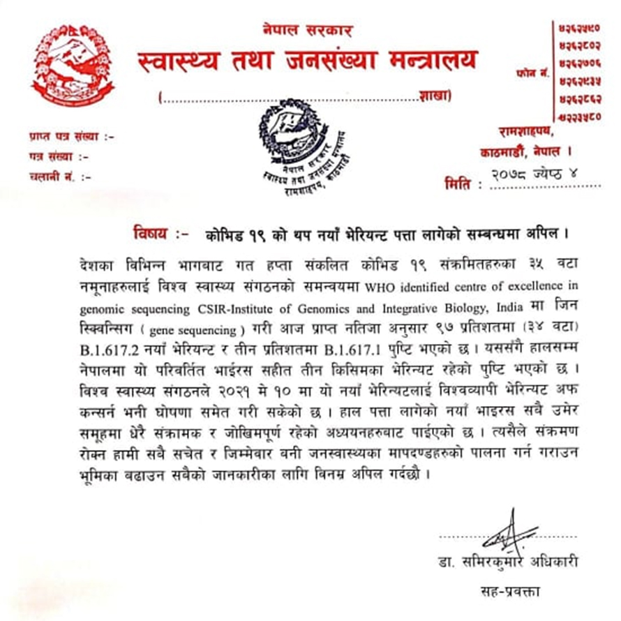 परिवर्तित भाइरस सहित हालसम्म नेपालमा तीन किसिमको भेरियन्ट पुष्टि भएको मन्त्रालयले जनाएको छ ।