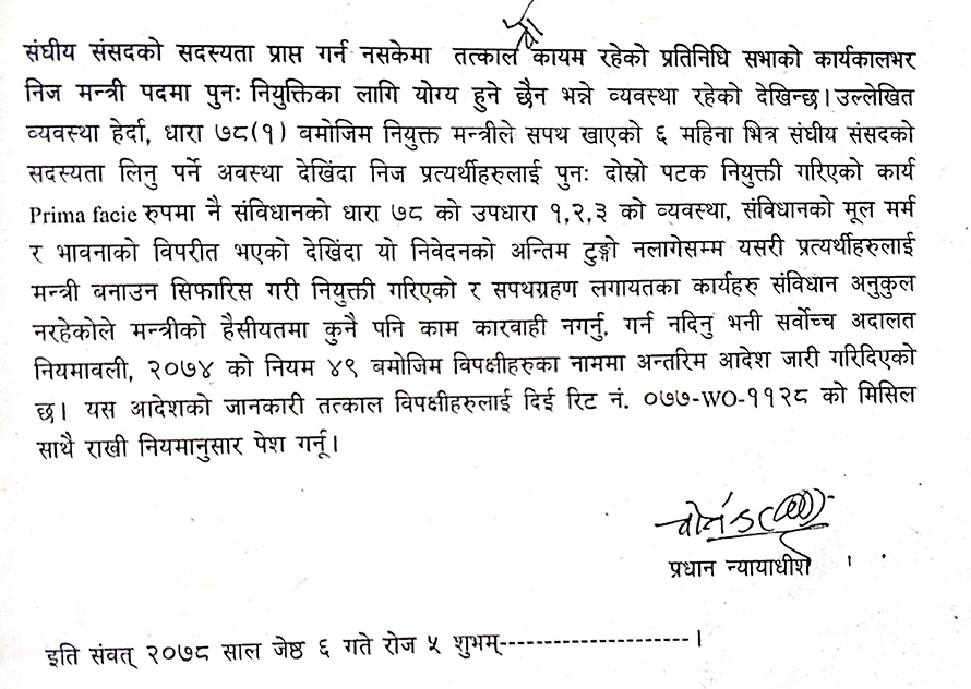 अधिवक्ता कपिलदेव ढकाल र विराज थापाले दायर गरेका रिट माथिको प्रारम्भिक सुनुवाइ पछि प्रधानन्यायाधीश राणाले उनीहरूलाई गरिएको नियुक्ति र सपथ ग्रहण लगायतका काम संविधान अनुकुल नभएकाले मन्त्रीको हैसियतमा काम नगराउन आदेश गरेको हो।