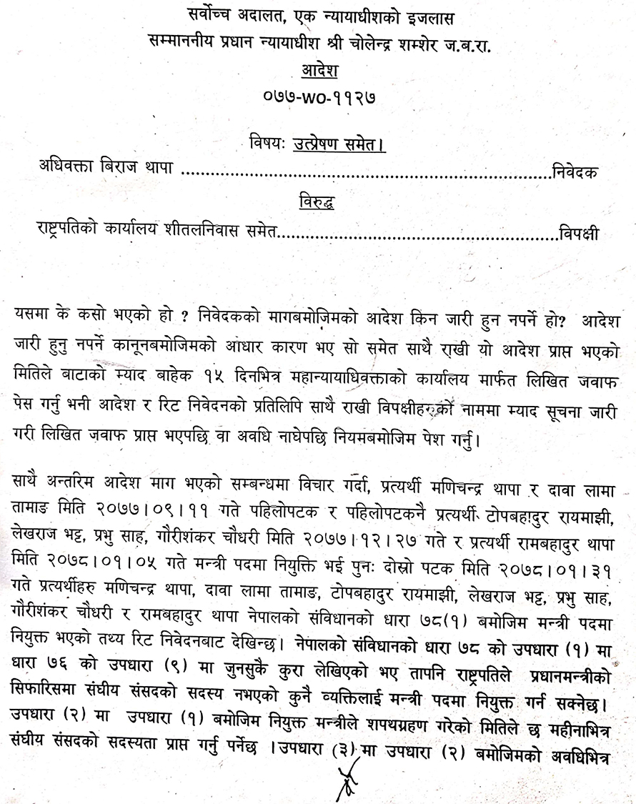 बादल सहित ७ मन्त्रीको नियुक्ति बदर गर्न सर्वोच्चको आदेश