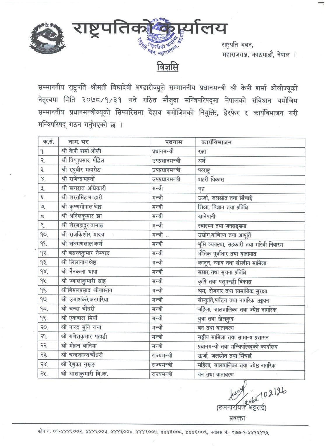 प्रधानमन्त्री केपी शर्मा ओलीले एमाले र राजपाका नेताहरूलाई समेटेर एक राज्यमन्त्री सहित आठ जना मन्त्री थप गर्दे बिहिबार २५ सदस्यीय मन्त्रिमण्डल बनाउनु भएको हो ।यससँगै मन्त्रिपरिषद्ले पूर्णता पाएको छ ।