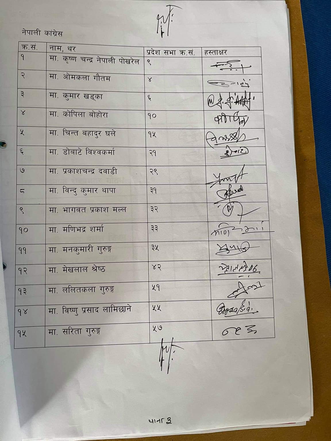प्रदेश प्रमुखले भोलि दिउँसो ३ बजेसम्मको समय तोकेर आह्वान गरे पनि बहुमत सदस्य (३१) सहित आजै उपस्थित भएर बुझाइएको कांग्रेस संसदीय दलका नेता कृष्णचन्द्र नेपाली पोखरेलले बताए ।