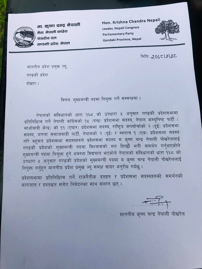 गण्डकीको मुख्यमन्त्रीमा नेपालीले गरे दावी पेश , प्रदेश प्रमुख समक्ष बुझाए ३१ सांसदहरुको हस्ताक्षर