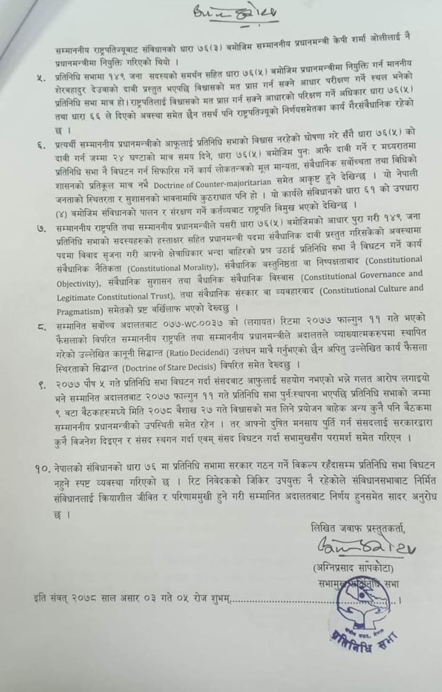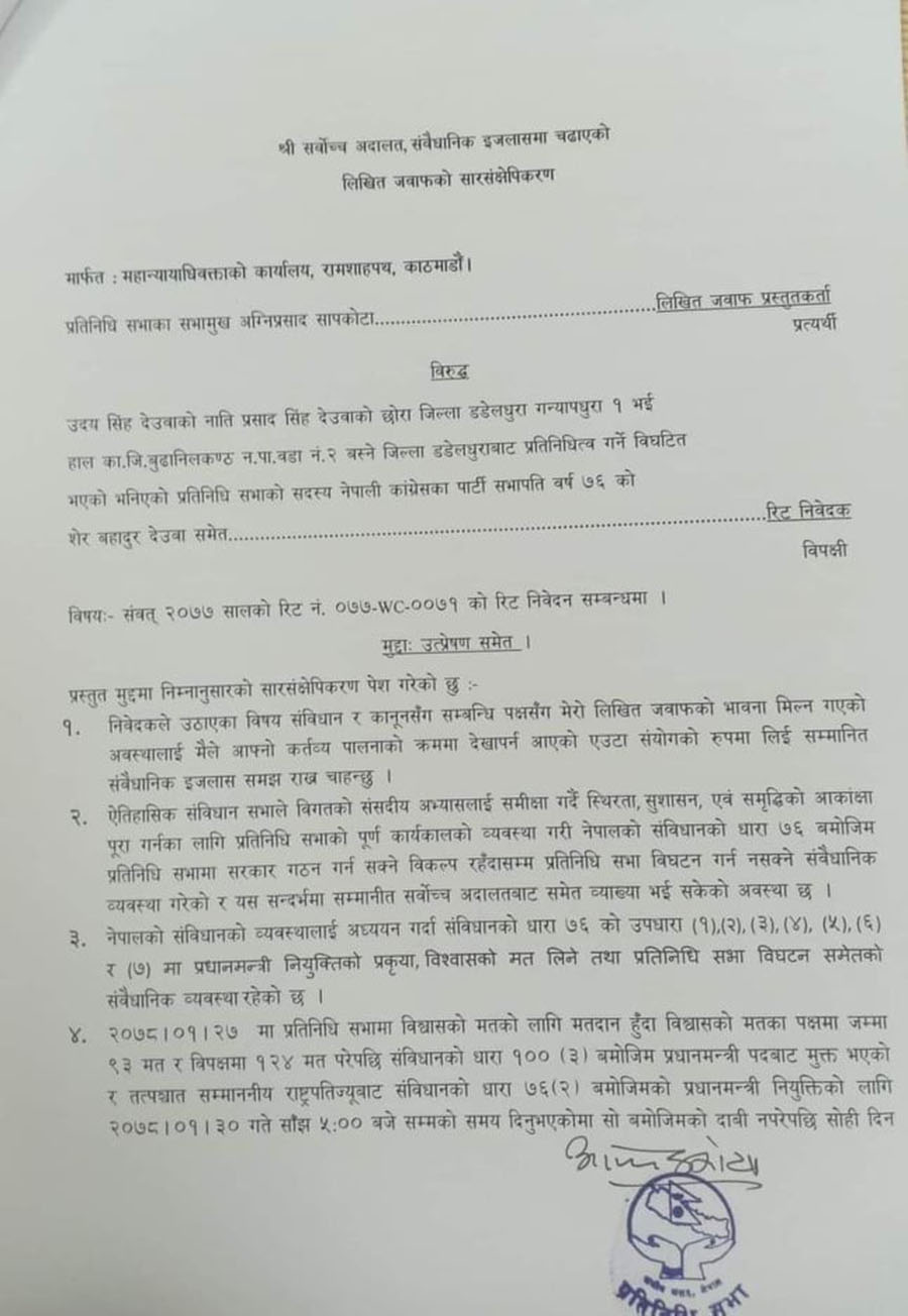 सभामुख सापकोटाद्धारा पेश गरिएको जवाफमा भनिएको छ, ‘संविधानको धारा ७६ (५) बमोजिम आधार पूरा गरी १४९ जना प्रतिनिधिसभाका सदस्यहरुको हस्ताक्षर सहित प्रधानमन्त्री पदमा संवैधानिक दाबी प्रस्तुत गरिसकेको अवस्थामा पदमा विवाद सृजना गरी आफ्नो क्षत्राधिकार भन्दा बाहिरको प्रश्न उठाइ प्रतिनिधिसभा नै विघटन गर्ने कार्य संवैधानिक नैतिकता, संवैधानिक वस्तुनिष्ठता वा निषपक्षतावाद, संवैधानिक सुशासन तथा वैधानिक संवैधानिक विश्वास तथा संवैधानिक संस्कार वा व्यवहारवाद समेत प्रष्ट बर्खिलाफ भएको देख्दछु ।’