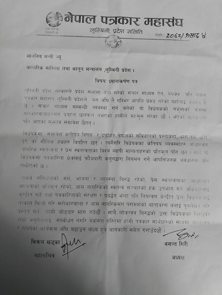 शुक्रबार आन्तरीक मामिला तथा कानुन मन्त्री चेतनारायाण आचार्यलाई पत्रकार महासंघ लुम्बिनीका अध्यक्ष बसन्त गिरी, महासचिव विक्रम खड्काले ज्ञापनपत्र बुझाउँदै सञ्चारमाध्यम र पत्रकारलाई नियन्त्रण गर्ने गरि ल्याएको विधेयक अमान्य भएको भन्दै पुनर्लेखन गर्न माग गरेका हुन् । पूर्ण प्रेस स्वतन्त्रता, लोकतन्त्र र स्वतन्त्र प्रेस एंव अभिव्यक्ति स्वतन्त्रता विरोधी प्रावधान विधेयकमा उल्लेख भएकाले त्यसलाई संसदबाट फिर्ता गर्न ज्ञापनपत्रमा भनिएको छ ।