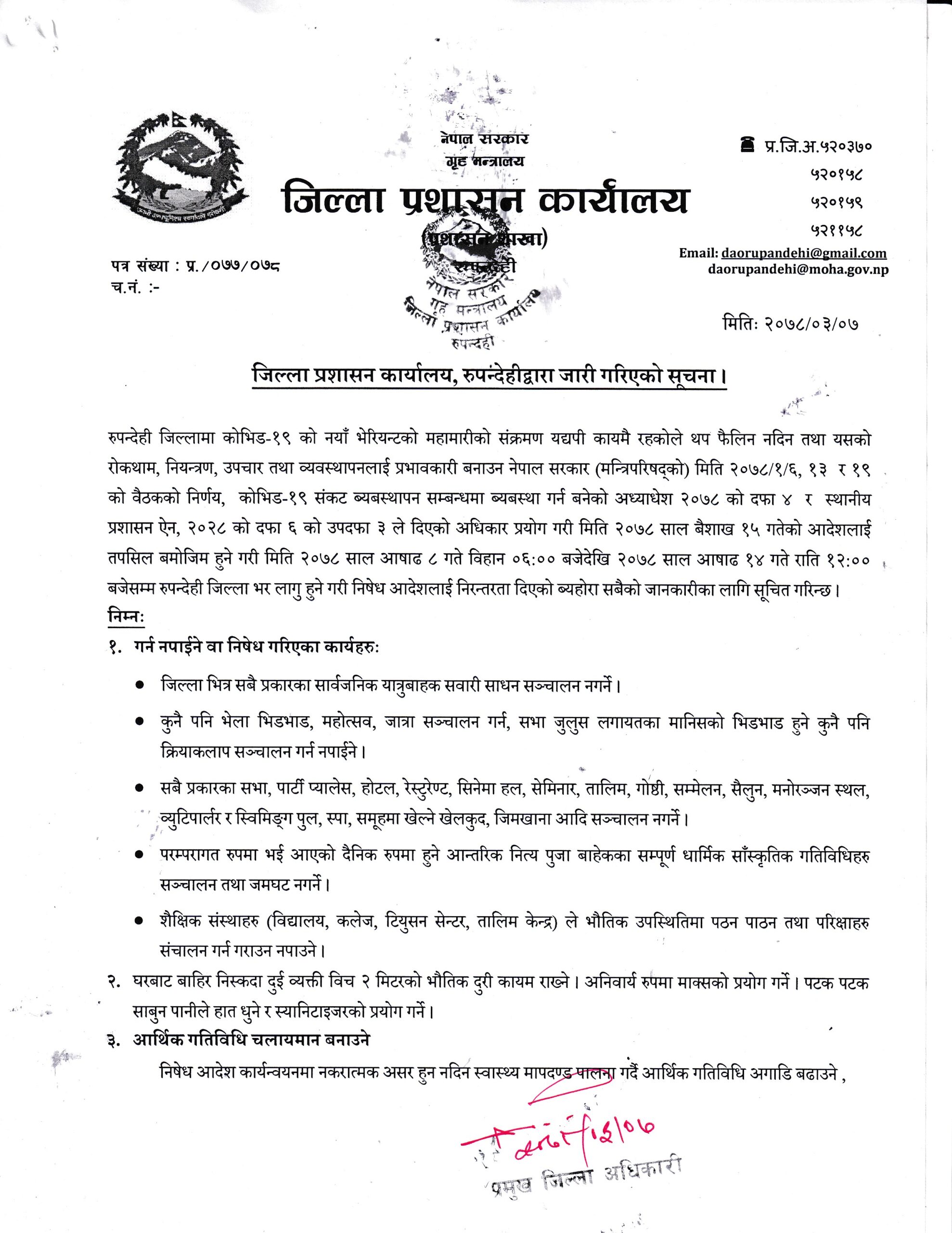 रुपन्देहीमा असार १४ गतेसम्म निषेधआज्ञा थपियो, नीजि सवारी जोर-विजोर प्रणालीमा चल्न पाउने