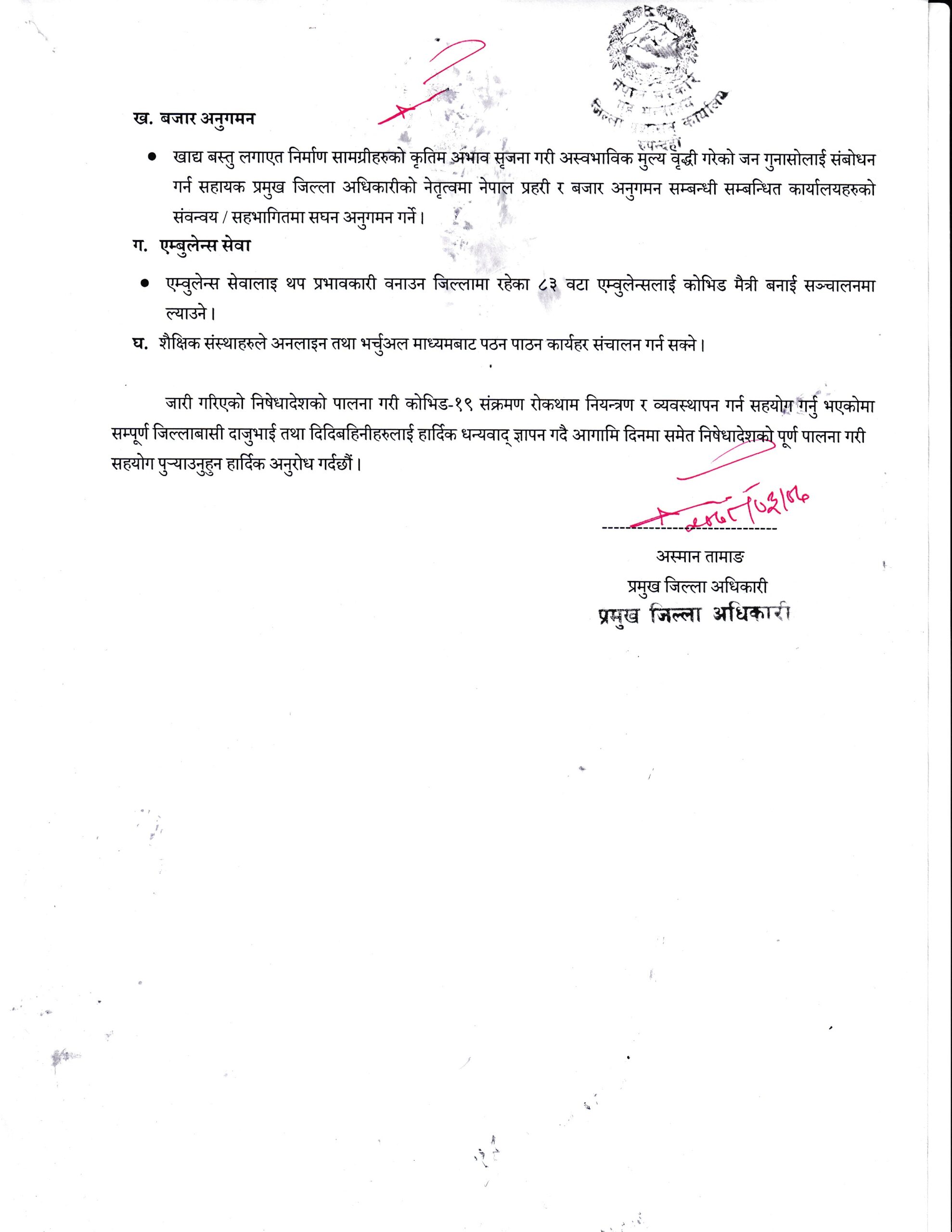 निषधआज्ञाको अवधिमा जिल्लामा सार्वजनिक यात्रुबाहक सवारी साधन सञ्चालनमा रोक लगाइएको छ । कुनै पनि भेला भिडभाड, महोत्सव, जात्रा सञ्चालन गर्न,सभा जुलुस लगायतका मानिसको भिडभाड हुने कुनै पनि क्रियाकलाप सञ्चालन गर्न पाइने छैन । त्यस्तै सबै प्रकारका सभा, पार्टी प्यालेस, होटेल, रेस्टुरेन्ट, सिनेमा हल, सेमिनार, तालिम, गोष्ठी, सम्मेलन, सैलुन, मनोरञ्जन स्थल, व्युटिपार्लर र स्विमिङपुल स्पा, समूहमा खेल्ने खेलकुद, जिमखाना आदि सञ्चालन गर्न पाइने छैन भने -आन्तरिक नित्य पुजाबाहेकका सबै धार्मिक साँस्कृतिक गतिविधिहरु सञ्चालन तथा जमघटलाई पनि रोक लगाएको छ । त्यस्तै शैक्षिक संस्थाहरुले भौतिक उपस्थितिमा पठनपाठन तथा परीक्षाहरु संचालन गर्न पनि निषेध गरेको छ ।