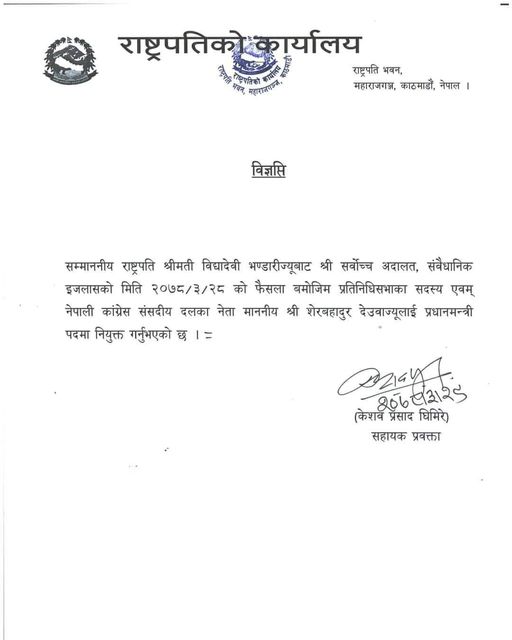 सोमबार सर्बोच्च अदालतले संसद पुनःस्थापना गर्दै देउवालाई प्रधानमन्त्री नियुक्त गर्न राष्ट्रपतिलाई परमादेश गरेको थियो । मंगलबार साँझ ५ बजेभित्र नियुक्त गर्नुपर्ने परमादेश अनुसार राष्ट्रपतिले देउवालाई प्रधानमन्त्री नियुक्त गर्नुभएको हो ।