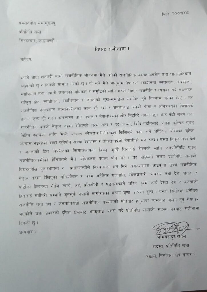 रावलले ‘यस्तो स्थितिमा अनैतिक राजनीति तथा देश र जनताविरोधी राजनीतिक अभ्यासको मतियार हुनु भन्दा त्यसबाट अलग हुनु श्रेयष्कर भएकोले उक्त प्रकारको दूषित खेलबाट आफूलाई अलग गर्दै प्रतिनिधिसभाको सदस्य पदबाट राजीनामा दिएको छु’ उनले राजीनामा पत्रमा लेखेका छन् ।