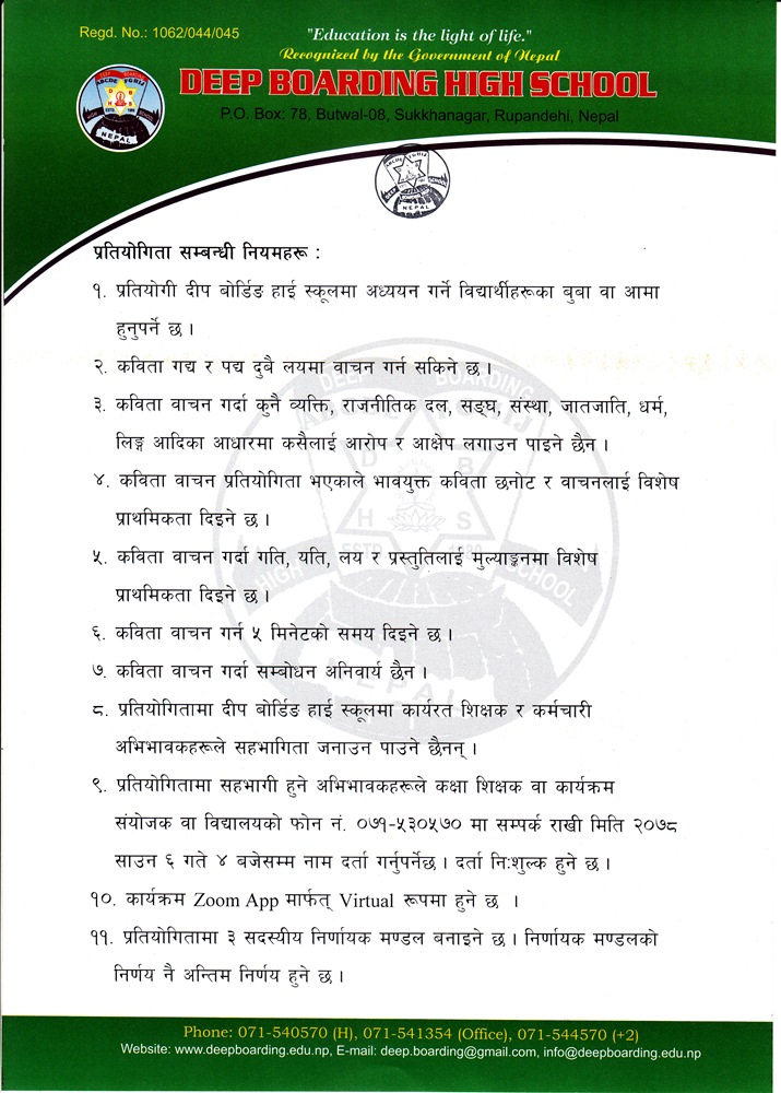 जुम एप मार्फत् भर्चुअल रूपमा दिउँसो २ बजे सुरु हुने प्रतियोगितामा दीप बोर्डिङ हाई स्कूलमा अध्ययन गर्ने विद्यार्थीहरूका अभिभावक आमाबुबाले मात्र भाग लिन पाउने कुरा कार्यक्रम संयोजक पुरुषोत्तम पाण्डेयले बताउनुभयो ।