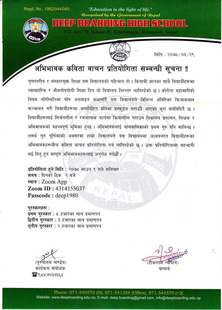 बुटवल । बुटवल–८, सुख्खानगरमा अवस्थित दीप बोर्डिङ हाई स्कूलले गुरुपूर्णिमाको अवसरमा साउन ९ गते शनिबार अभिभावक कविता वाचन प्रतियोगिता गर्ने भएको छ ।