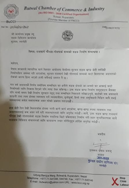 संघले सोमबार सडक डिभिजन कार्यालय बुटवलमा ज्ञापन पत्र बुझाउँदै बुटवलको राजमार्ग चौराहादेखि गोलपार्क सम्मको सडकमा जताततै खाल्डाखुल्डी हुँदा आवतजावतमा समेत समस्या भएकोले त्यसलाई समेत व्यबस्थित गर्न ध्यानाकर्षण गराएको छ । सडक डिभिजन कार्यालय बुटवलका प्रमुख जयलाल मसासिनीलाई ज्ञापन पत्र बुझाउँदै संघका अध्यक्ष उज्ज्वल प्रसाद कसजूले व्यापारिक मार्ग अन्तरगत चौराहा देखि गोलपार्क खण्डमा बिस्तारको काम सुरु भएको र त्यसलाई खण्ड खण्डमा काम गर्न आग्रह गर्नुभयो । त्यस्तैगरी चौराहा देखि गोलपार्क सम्मको मुख्य सडकमै जताततै खाल्डैखाल्डा हुँदा आवत जावतमा समस्या हुनुको साथै दुर्घटनाको जोखिम समेत उत्तिकै भएकाले समयमै मर्मत सम्भारमा ध्यान दिन आग्रह गर्नुभयो । उहाँले सडक बिस्तारमा गुणस्तरमा समेत विशेष ध्यान दिन आग्रह गर्नुभयो ।