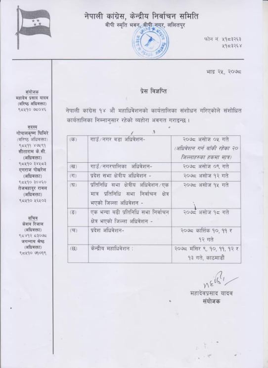 एक भन्दा बढी प्रतिनिधिसभा निर्वाचन क्षेत्र भएको जिल्ला अधिवेशन असोज १८ गते, प्रदेश अधिवेशन कार्तिक १०,११ र १२ गते र केन्द्रिय महाधिवेशन मंसिर ९–१३ गते गर्ने गरी तालिका संशोधन गरिएको छ ।