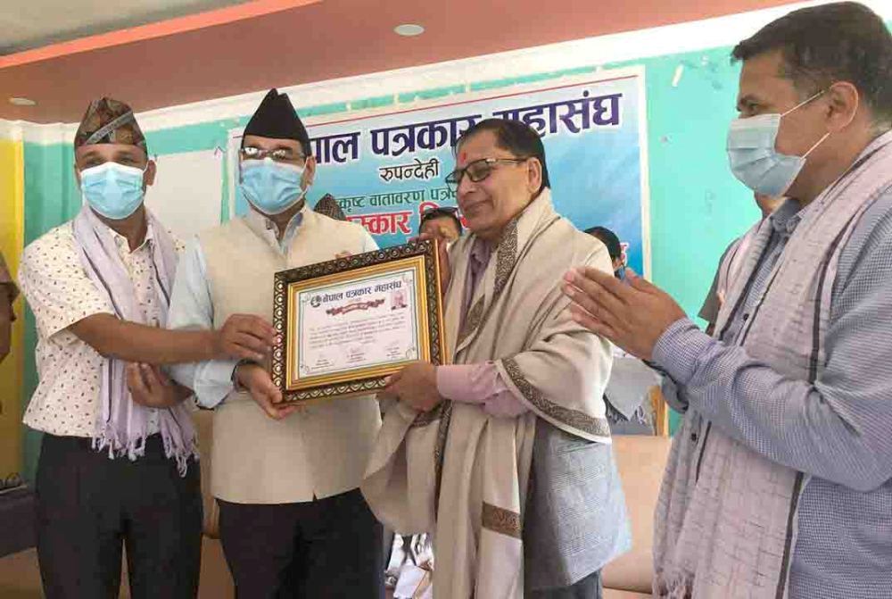 नेपाल पत्रकार महासंघ रुपन्देहीले प्रदान गर्ने उत्कृष्ट वातावरण पत्रकारिता पुरस्कार २०७७ बाट पत्रकार टिआर शर्मा पुरस्कृत भएका छन । अग्रज पत्रकार नारायण सापकोटाद्धारा स्थापना गरिएको पुरस्कार मुख्यमन्त्री कुल प्रसाद केसी र पत्रकार महासंघका केन्द्रीय अध्यक्ष विपुल पोख्रेल र संस्थापक सापकोटाले प्रदान गरेका हुन ।