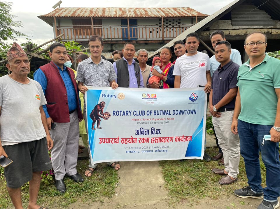बुटवल । कपिलवस्तु बाणगंगा नगरपालिका वडा नं ८ चप्परगाउँकी अनौठो रोग म्यास्थेनिक क्राईसिस रोगका कारण उपचारमा रहेकी २ महिनाका सुत्केरी अनिता विकलाई रोटरी क्लब अफ बुटवल डाउनटाउनले १ लाख ११ हजार रुपैया बराबर रकम सहयोग गरेका छन । एक समारोहका बिच शनिबार रोटरी ईन्टरनेश्नल ३२९२ डिष्ट्रिक जोन २३ का ए.जि.नारायण प्रसाद पन्थ, ए.जि. जिवन अधिकारी, क्लबका अध्यक्ष जबिन कक्षपति, पुर्व अध्यक्ष भिमराज श्रेष्ठ, रबि पोखरेल, प्रसिडेन्ट इलेक्ट भरत राना, प्रेसिडेन्ट नोमिनी कमला हमाल, सहकोषाध्यक्ष हरि खरेल, सचिव बाबुराम बन्जाडे, दिपक पौडेलले बिरामीका ससुराबुबा लोक बहादुर बिकलाई सहयोग रकम हस्तान्तरण गरेका छन ।