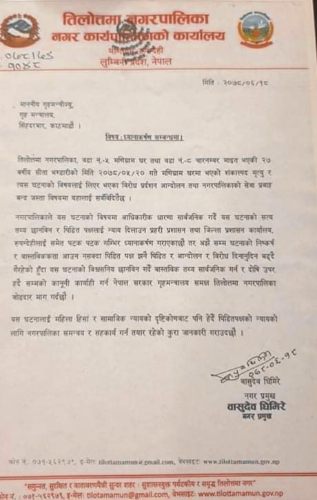 नगरपालिकाले घटनाको विश्वसनीय छानबिन गर्दै वास्तविक तथ्य छिटो सार्वजनिक गर्न र दोषी उपर हदैसम्मको कानूनी कार्वाही गर्न गृहमन्त्रीसँग माग गरेको छ । घटनाको विषयमा यस अघि नैं आफ्नो आधिकारिक धारणा सार्वजनिक गरेको तिलोत्तमा नगरपालिकाले सत्य तथ्य छानविन र पीडित पक्षलाई न्याय दिलाउन प्रहरी प्रशासन तथा जिल्ला प्रशासन कार्यालयलाई समेत पटक पटक गम्भीर ध्यानाकर्षण गराए पनि अझैसम्म घटनाको निष्कर्ष र वास्तविकता आउन नसक्दा पीडित झनै पीडित र आन्दोलन र विरोध दिनानुदिन बढ्दै गैरहेको गृहमन्त्री खाँणलाई जानकारी गराएको छ ।
