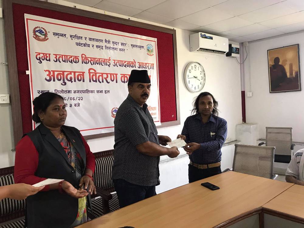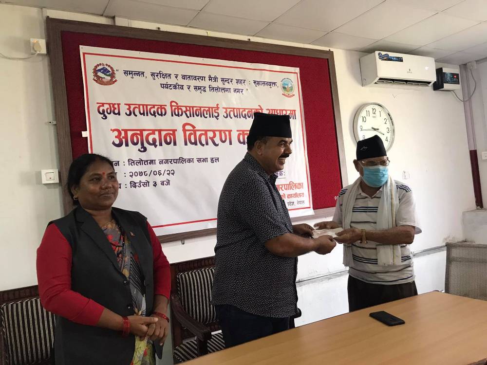 तिलोत्तमा । रुपन्देहीको तिलोत्तमा नगरपालिकाले नगरका दुग्ध उत्पादक किसानलाई उत्पादनको आधारमा अनुदान रकम प्रदान गरेको छ । नगरपालिकाले सहकारीमार्फत् दुग्ध उत्पादक किसानलाई प्रतिलिटर एक रुपैंयाँको दरले अनुदान उपलब्ध गराएको हो । उत्पादनको आधारमा अनुदान दिने नीति अनुरुप यो वर्ष किसानले ४६ लाख ६ हजार ५ सय ६९ रुपैंयाँ प्राप्त गरेका छन् ।
