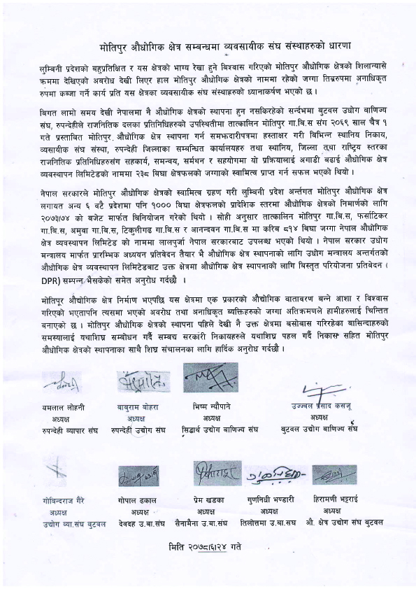 बुटवल उद्योग वाणिज्य संघका अध्यक्ष उज्ज्वलप्रसाद कसजू, सिद्धार्थनगर उद्योग वाणिज्य संघका अध्यक्ष भिष्म न्यौपाने, रुपन्देही उद्योग संघका अध्यक्ष बाबुराम बोहोरा, रुपन्देही व्यापार संघका अध्यक्ष यमलाल लोहनी, तिलोत्तमा उद्योग वाणिज्य संघका अध्यक्ष गुणनिधी भण्डारी, सैनामैना उद्योग वाणिज्य संघका अध्यक्ष प्रेम खड्का, देवदह उद्योग वाणिज्य संघका अध्यक्ष गोपाल ढकाल, उद्योग व्यापार संघ बुटवलका अध्यक्ष गोविन्दराज गैरे र औद्योगिक क्षेत्र उद्योग संघका अध्यक्ष हिरामणी भट्टराईले आईतबार संयुक्त रुपमा विज्ञप्ती जारी गरेर मोतिपुर औद्योगिक क्षेत्रमा भएको अवरोधको निकास सहित सिघ्र सञ्चालनको वातावरण तयार गर्न आग्रह गर्नुभएको हो ।