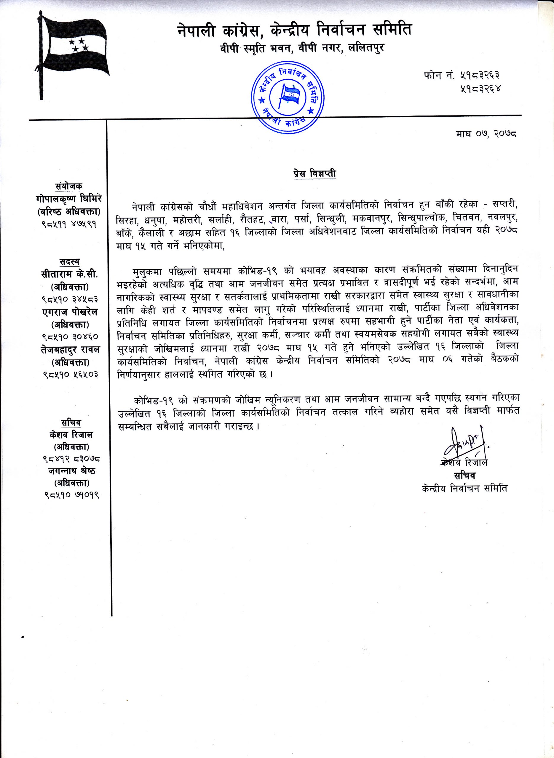 काठमाण्डौं । कोरोनाका कारण नेपाली कांग्रेसको १६ जिल्लाको अधिवेशन फेरि स्थगित भएको छ । कांग्रेसको केन्द्रीय निर्वाचन समितिले अर्को सूचना जारी नहुन्जेल सम्मका लागि जिल्ला अधिवेशन स्थगित गर्ने निर्णय गरेको हो । कोरोना महामारीका कारण जिल्ला अधिवेशन स्थगित गरिएको निर्वाचन समितिले जनाएको छ । यही माघ १५ गतेका लागि अधिवेशन गर्ने मिति तय भएको थियो।
