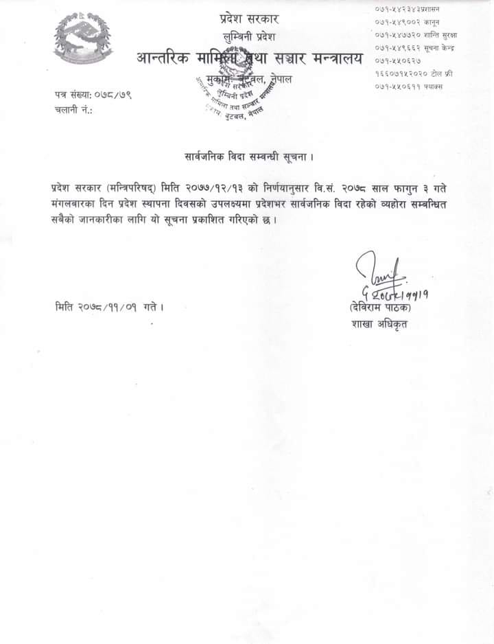लुम्बिनी प्रदेशमा फागुन ३ गते सार्वजनिक विदा