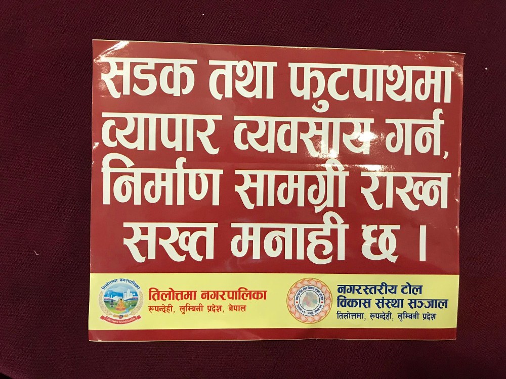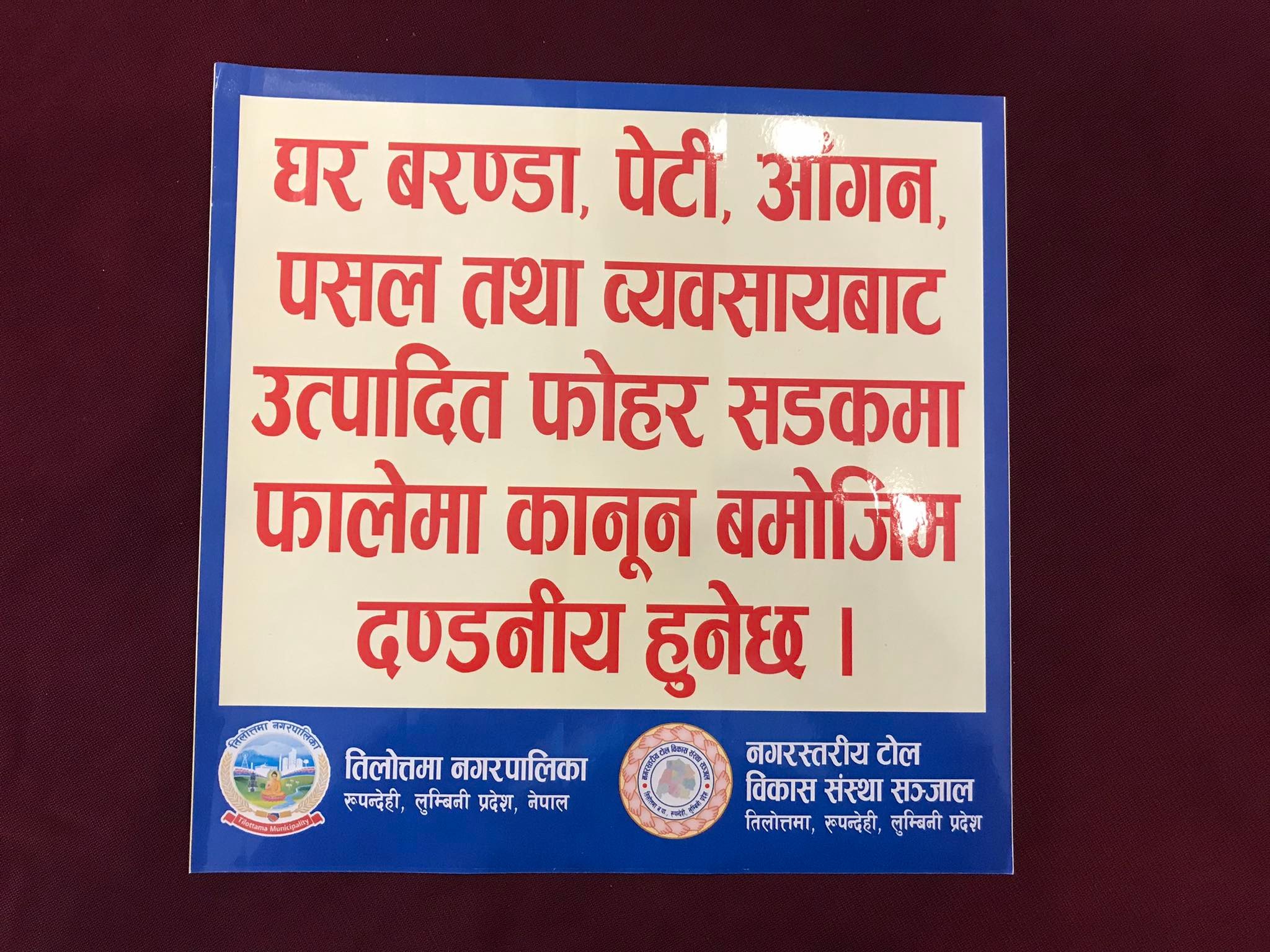 तिलोत्तमा । रुपन्देहीको तिलोत्तमा नगरपालिकामा सरसफाई अभियानलाई नगरबासीको घर—टोलमा केन्द्रित गर्न थालिएको छ । प्रत्येक घर, व्यवसायिक प्रतिष्ठान, संघ—संस्था, निकायमा जथाभावी फाहोर नगर्ने प्रतिबद्धता सहितको स्टिकर टाँस गरेर नगरपालिकाले सरसफाई अभियानलाई थप प्रभावकारी बनाएको हो । नगरपालिकामा नियमित रुपमा टोल विकास संस्थामार्फत् नियमित रुपमा समुदाय सरसफाई अभियान सञ्चालन हुँदै आएको छ ।