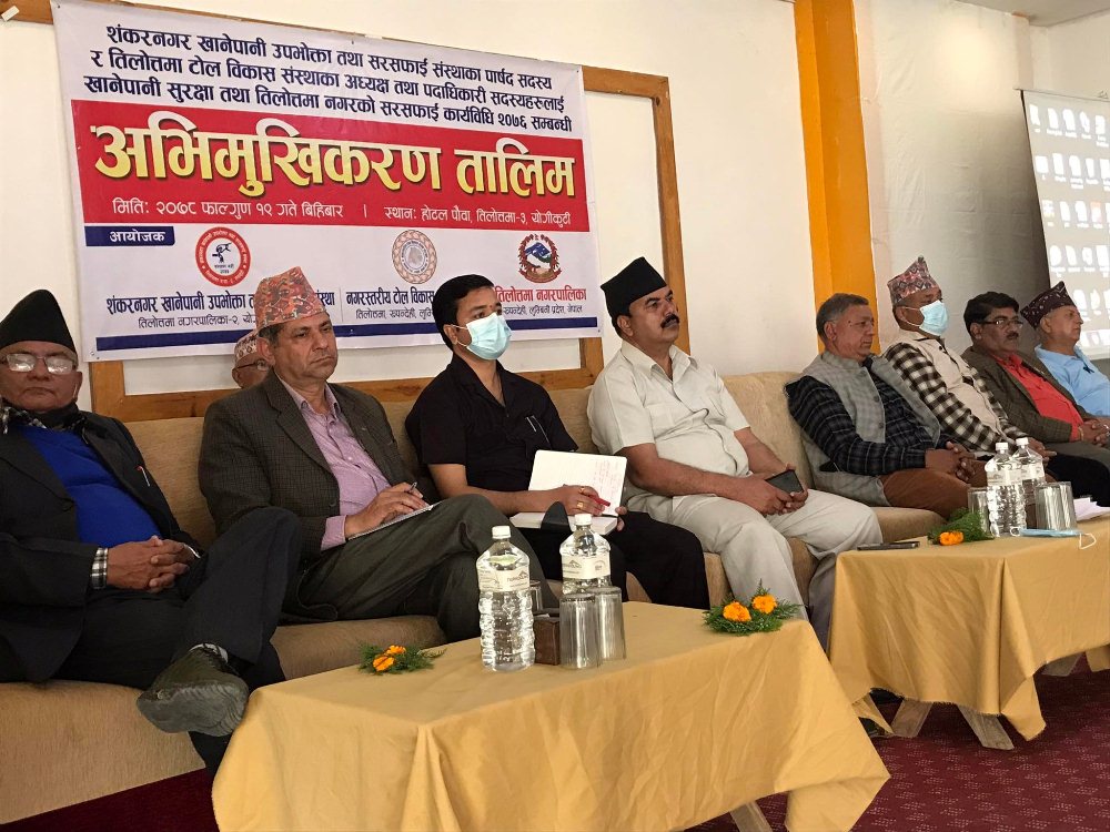 यसैक्रममा सोही अभियानको सन्दर्भमा नगरपालिका, सञ्जाल र शंकरनगर खानेपानी उपभोक्ता तथा सरसफाई संस्थाको संयुक्त आयोजनामा बिहीबार वडा नं. १, २, ३ र ४ का टोल सञ्जालका पदाधिकारी तथा खानेपानीका पार्षद्हरुको लागि अभिमुखीकरण कार्यक्रम गरिएको भएको छ । त्यसअवसरमा नगर प्रमुख बासुदेव घिमिरेले टोल विकास संस्था र खानेपानी सेवा क्षेत्रका पदाधिकारीहरुलाई स्टिकर हस्तान्तरण गर्नुभयो ।