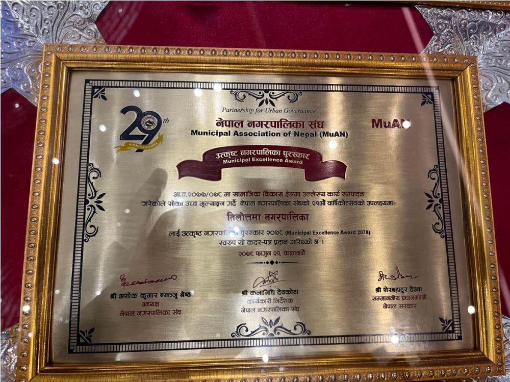 तिलोत्तमा । रुपन्देहीको तिलोत्तमा नगरपालिकाले लगातार दोस्रो पटक उत्कृष्ट नगरपालिका पुरस्कार प्राप्त गरेको छ । मुलुकभरका महानगर, उप–महानगर र नगरपालिकाहरुको छाता संगठन नेपाल नगरपालिका संघले सो पुरस्कार प्रदान गरेको हो । आर्थिक वर्ष २०७७/०७८ मा सामाजिक विकास क्षेत्रमा उल्लेख्य कार्य सम्पादन गरेकोले त्यसको मूल्यांकन गर्दै पुरस्कार प्रदान गरिएको संघले जनाएको छ ।