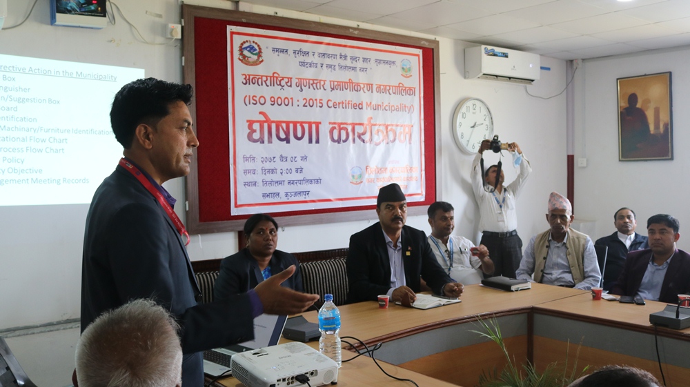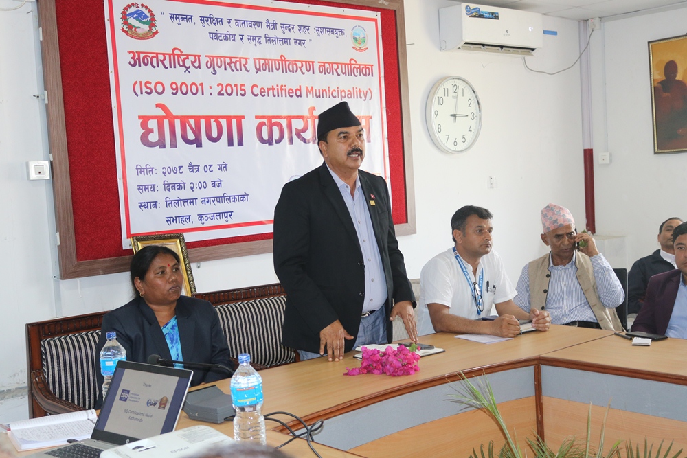 कार्यक्रममा नगर प्रमुख बासुदेव घिमिरेले सबैको सहकार्यले नगरपालिकाले अन्तर्राष्ट्रिय गुणस्तर प्राप्त गरेको बताउँदै सबैप्रति आधार व्यक्त गर्नुभयो । उहाँले ३ वर्षसम्म म्याद रहने सो गुणस्तरलाई दिगोपन दिन सबै कर्मचारी, जनप्रतिनिधि नगरबासीहरुको महत्वपूर्ण भूमिका रहने बताउनुभयो ।